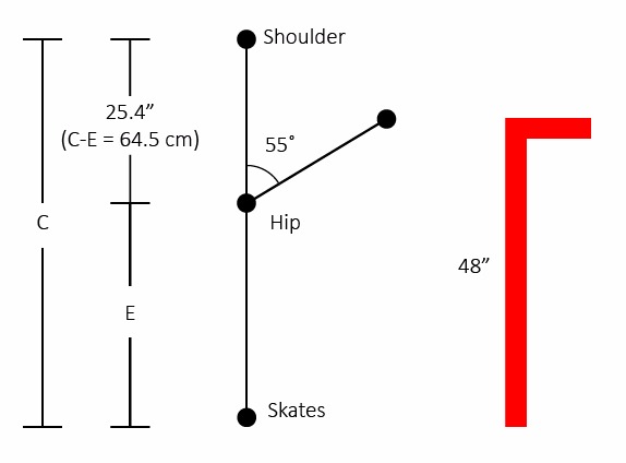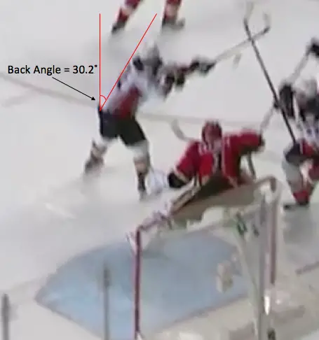 For Thompson’s stick to be at crossbar level, he must lower his height by 11.5″ from bending his back. An angular measurement shows that his back must be at an angle of 55˚ to achieve this reduction. However, from analyzing his position at the moment he makes contact with the puck, his back angle is at only 30.2˚.
